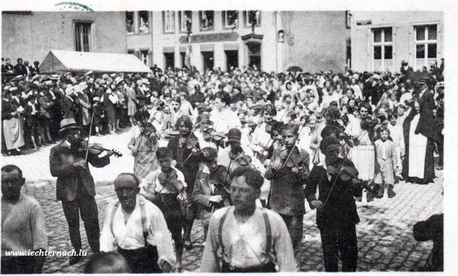 The historic "dancing procession" of Echternach. 1.Some 13.000 pilgrims meet in Echternach on Tuesday after Whitsun to take part in the procession. They carry on with a popular, ancient tradition, which has survived political upheavals and church prohibitions.